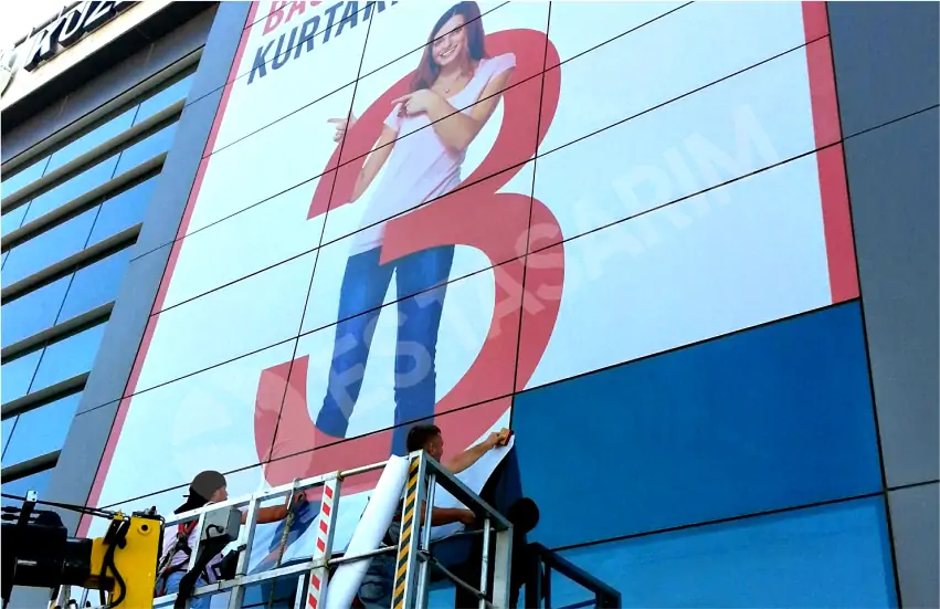 Cephe giydirme uygulamaları, binaların dış yüzeyini baştan sona yenileyerek markaya güçlü bir görünüm kazandırır. Geniş alanlarda etkili bir reklam yüzeyi oluşturur.